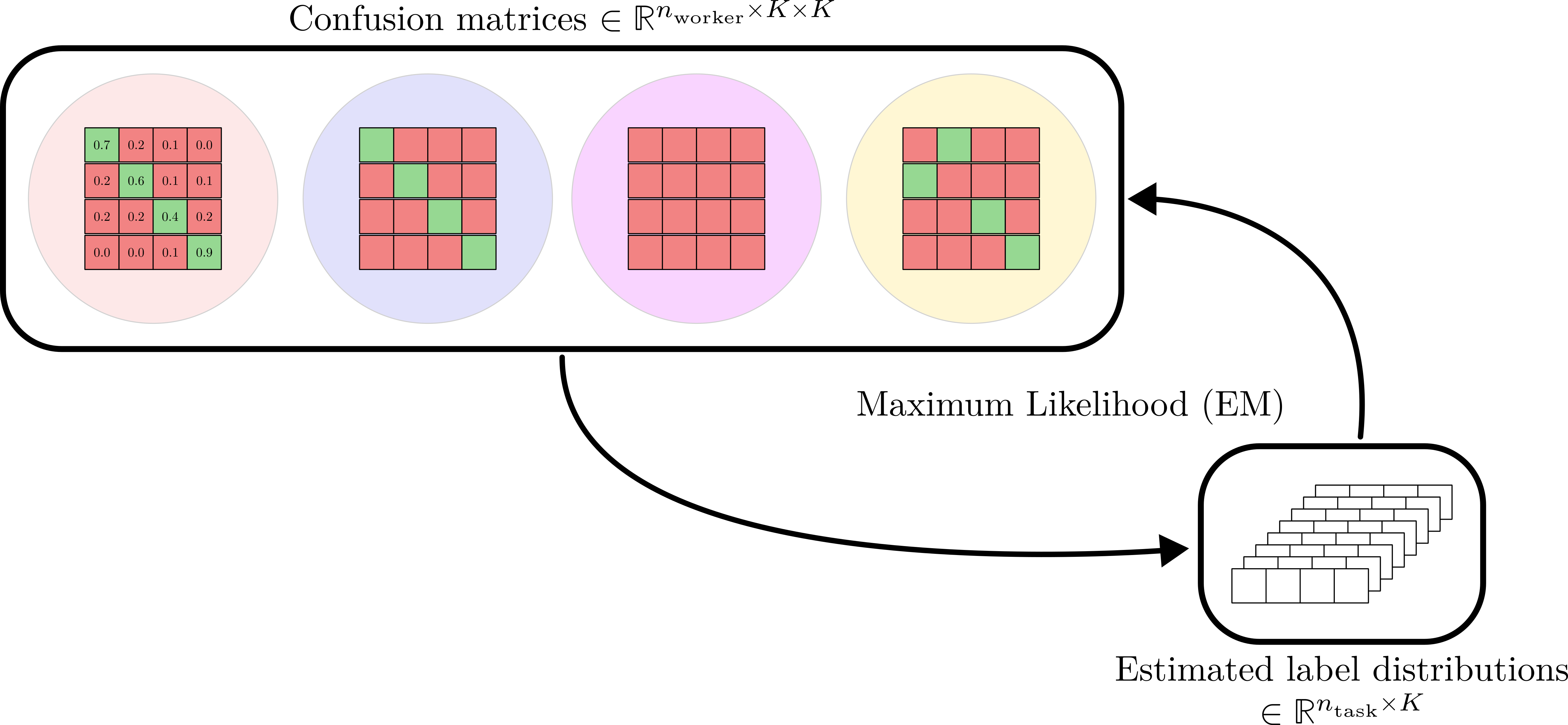 where \(\pi^{(j)}_{k,\ell}=\mathbb{P}(\text{worker } j \text{ answers } \ell \text{ with truth } k)\)