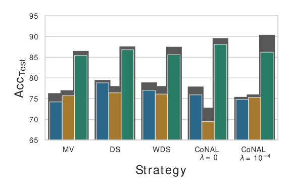 \[\begin{align*} H(p)&=-\sum_{k}p_k\log(p_k) \quad\text{with}\quad p = \frac{1}{|\mathcal{A}(x_i)|}\left(\sum_{j\in \mathcal{A}(x_i)} \mathbf{1}(y_i^{(j)}=k)\right)_{k\in[K]} \end{align*}\]