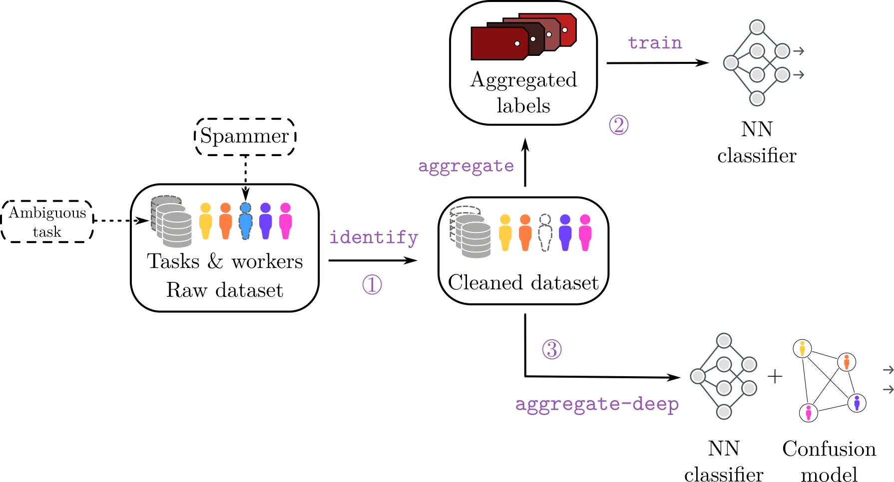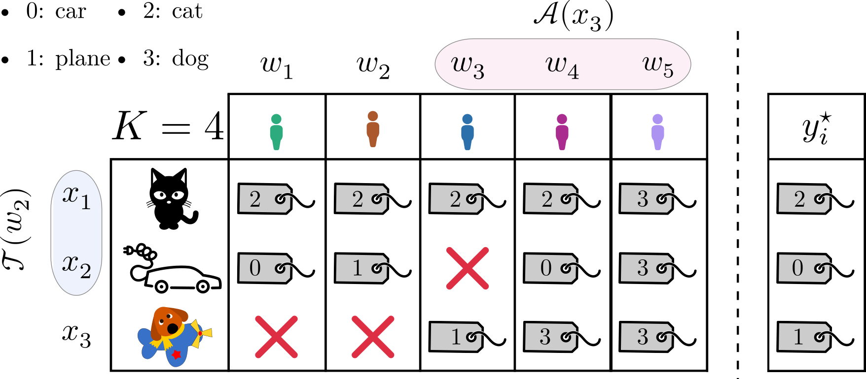 \(\Longrightarrow\) We write \(y_i^{(j)}\) the answer from worker \(w_j\) to task \(x_i\) \(\Longleftarrow\)