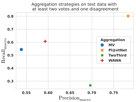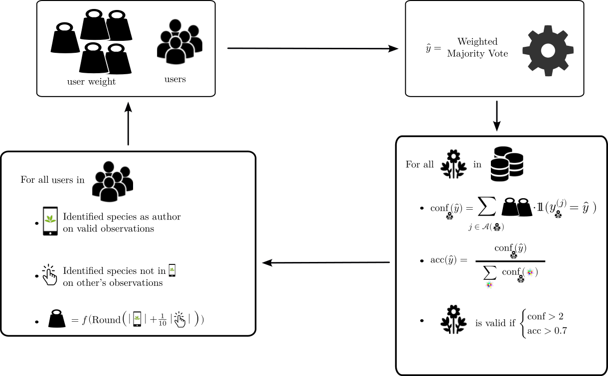 \[ \hat y_i = \underset{k\in[K]}{\mathrm{argmax}}\left(\sum_{j\in\mathcal{A}(x_i)} s^{(j)}\mathbf{1}(y_i^{(j)}=k)\right)_k \]