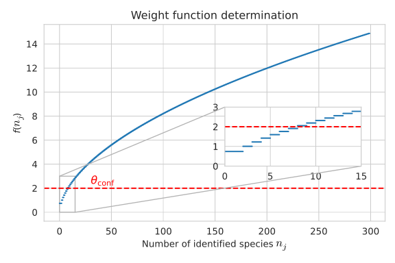 \[ f(n_j)=n_j^\alpha - n_j^\beta + \gamma, \text{ with }\begin{cases} \alpha=0.5 \\ \beta=0.2 \\ \gamma=\log(2.1)\simeq 0.74 \end{cases} \]